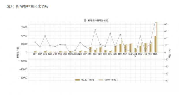 上周25城新增客户量环比有23个城市有涨幅,涨幅超过10%的城市有18个。新增客户量环比下跌的有惠州, 天津,跌幅在1.05%-10.93%之间。上周成都市场的新增客户量达到72616人,成为25城中新增客户最多的城市。