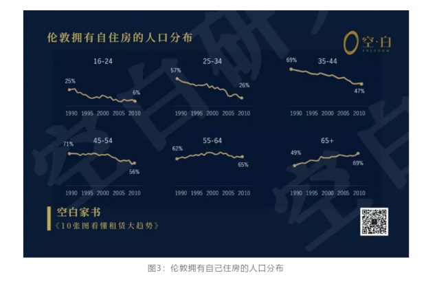 下面这张图是伦敦不同年龄层的人口,通过买房解决居住问题的比例变化。