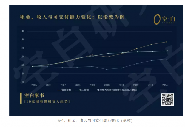 例如,从2005年到2018年,经通胀调整后,伦敦的平均租金上涨超过30%,而平均收入只上涨不足20%,这就意味着负担能力的恶化。